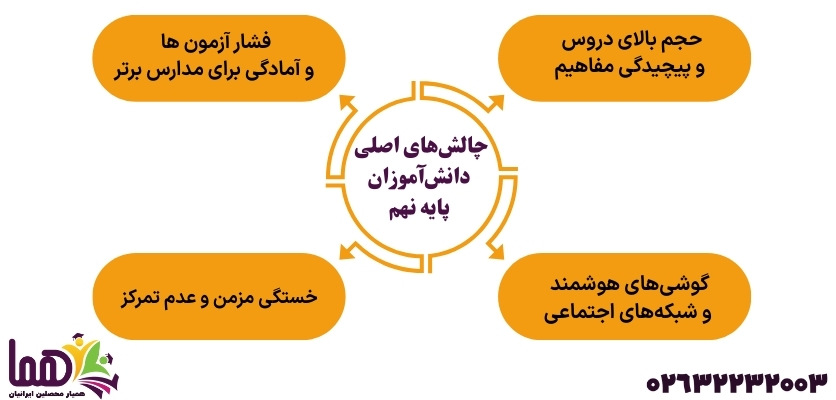 پایه نهم برای بیشتر دانش‌آموزان به چالشی بزرگ تبدیل شده است.از یک‌طرف، فشار شدید آزمون‌های ورودی مدارس تیزهوشان و نمونه دولتی به شدت افزایش یافته است، و از طرف دیگر، انتخاب رشته‌ای که سرنوشت آینده تحصیلی و شغلی را تحت تأثیر قرار می‌دهد، حساسیت بالایی دارد. علاوه بر این، حجم مطالب مفهومی در دروس مختلف، به‌ویژه در درس‌هایی چون ریاضی، علوم، و عربی، نیازمند تمرکز و دقت بالایی است.